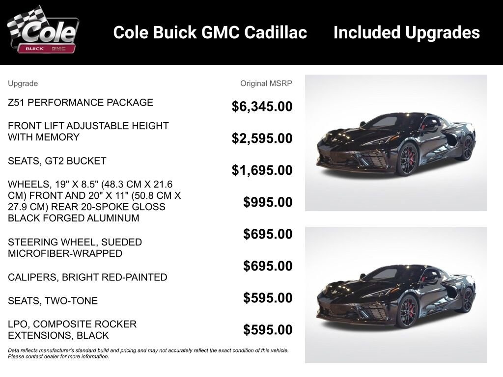 Chevrolet Certified Pre-Owned Certified, 14 Speakers, 2 Cargo Nets, 2-Tone Seats, 4-Wheel Disc Brakes, 8-Way Power Driver Seat Adjuster, 8-Way Power Passenger Seat Adjuster, ABS brakes, Air Conditioning, AM/FM radio: SiriusXM, Apple CarPlay/Android Auto, Auto-dimming door mirrors, Auto-dimming Rear-View mirror, Automatic Leveling System Headlamp Control, Automatic temperature control, Black Composite Rocker Extensions (LPO), Body-Color Removable Roof Panel, Bose Performance Series Sound System w/14 Speakers, Brake assist, Bright Red-Painted Calipers, Bumpers: body-color, Compass, Delay-off headlights, Driver door bin, Driver Power Bolster Seat Adjuster, Driver vanity mirror, Dual front impact airbags, Dual front side impact airbags, Electrical Theft Deterrent System, Electronic Limited-Slip Differential, Electronic Stability Control, Emergency communication system: OnStar and Chevrolet connected services capable, Four wheel independent suspension, Front anti-roll bar, Front Bucket Seats, Front Center Armrest, Front dual zone A/C, Front Lift Adjustable Height w/Memory, Front reading lights, Fully automatic headlights, Garage door transmitter, GT1 Bucket Seats, GT2 Bucket Seats, HD Front & Rear Vision Cameras, HD Radio, Head-Up Display, Heads-Up Display, Heated & Vented Driver & Passenger Seats, Heated door mirrors, Heated front seats, Heated Steering Wheel, Heated steering wheel, Heavy-Duty Cooling System, Illuminated entry, Leather Shift Knob, Leather steering wheel, Low tire pressure warning, Memory Driver & Passenger Convenience Package, Memory seat, Mulan Lthr Seating Surfaces w/Perforated Inserts, Navigation System, Occupant sensing airbag, Outside temperature display, Overhead console, Panic alarm, Passenger door bin, Passenger Power Bolster Seat Adjuster, Passenger vanity mirror, Performance Data & Video Recorder, Performance Exhaust w/Stainless-Steel Tips, Performance Rear Axle Ratio, Power door mirrors, Power Driver Lumbar Control Seat Adjuster, Power driver seat, Power Passenger Lumbar Control Seat Adjuster, Power passenger seat, Power steering, Power windows, Power-Adjustable Outside Heated Mirrors, Preferred Equipment Group 2LT, Premium audio system: Chevrolet Infotainment 3 Premium, Radio data system, Radio: Chevrolet Infotainment 3 Premium System, Rear anti-roll bar, Rear Camera Mirror, Rear Corvette Script Painted Torch Red (LPO), Rear Cross Traffic Alert, Rear window defroster, Rear Z51 Spoiler, Remote keyless entry, Security system, Side Blind Zone Alert, SiriusXM Radio, Speed control, Speed-sensing steering, Sport steering wheel, Steering wheel memory, Steering wheel mounted audio controls, Sueded Microfiber-Wrapped Steering Wheel, Tachometer, Telescoping steering wheel, Tilt steering wheel, Traction control, Trip computer, Turn signal indicator mirrors, Universal Home Remote, Variably intermittent wipers, Vehicle Inclination Theft Deterrent Sensor, Vehicle Interior Movement Theft Deterrent Sensor, Ventilated front seats, Voltmeter, Wheels