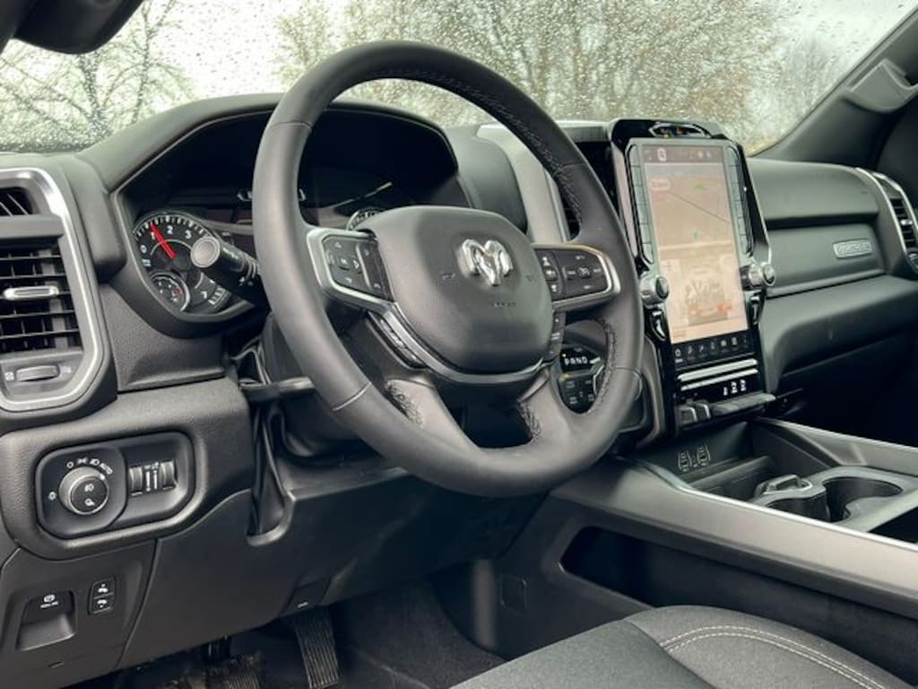 Blue Advantage Certified, 115V Auxiliary Power Outlet, 115V Auxiliary Rear Power Outlet, 12" Touchscreen Display, 2nd Row In Floor Storage Bins, 400W Inverter, 4G LTE Wi-Fi Hot Spot, 9 Amplified Speakers w/Subwoofer, Accent Color Door Handles, Accent Color Premium Power Mirrors, Accent Color Tailgate Handle, Air Conditioning ATC w/Dual Zone Control, Anti-Spin Differential Rear Axle, Apple CarPlay, Auto Power-Folding Mirrors, Auto-Dimming Exterior Driver Mirror, Auto-Dimming Rear-View Mirror, Big Horn Badge, Big Horn Level 2 Equipment Group, Black Exterior Mirrors, Black Exterior Truck Badging, Black Headlamp Bezels, Black Interior Accents, Black Painted Exterior Mirrors Caps, Black Premium Power Mirrors, Black Tail Lamp Bezels, Body Color Front Bumper, Body Color Rear Bumper w/Step Pads, Cluster 7.0" TFT Color Display, Configurable Drive Mode, Connected Travel & Traffic Services, Connectivity - US/Canada, Convex Wide-Angle Exterior Mirror Insert, Deluxe Cloth Bucket Seats, Exterior Mirrors Courtesy Lamps, Exterior Mirrors w/Heating Element, Exterior Mirrors w/Supplemental Signals, Glove Box Lamp, Google Android Auto, GPS Antenna Input, GPS Navigation, Grille Black Surround Black Mesh, HD Radio, Heated Front Seats, Heated Steering Wheel, Integrated Voice Command w/Bluetooth, Leather Wrapped Steering Wheel, LED Dome Lamp w/On/Off Switch, LED Footwell Lighting, Media Hub w/2 Charge Only USBs, Night Edition, Overhead LED Lamps, Power 2-Way Driver Lumbar Adjust, Power Adjust 8-Way Driver Seat, Power Adjustable Pedals, Premium Overhead Console, Quick Order Package 23Z Big Horn, Radio: Uconnect 5 Nav w/12.0" Display, RAM Grille Badge - Black, Rear Power Sliding Window, Rear Window Defroster, Remote Tailgate Release, Security Alarm, SiriusXM w/360L, Steering Wheel Mounted Audio Controls, Sun Visors w/Illuminated Vanity Mirrors, Universal Garage Door Opener, USB Host Flip, Wheels: 20" x 9.0" Aluminum Painted Clad, 3 Rear Seat Head Restraints, 4 Way Front Headrests, 4-Wheel Disc Brakes, 6 Speakers, ABS brakes, Air Conditioning, Alloy wheels, AM/FM radio, Apple CarPlay/Android Auto, Auto High-beam Headlights, Brake assist, Bucket Seats, Bumpers: chrome, Cloth Bench Seat, Compass, Delay-off headlights, Driver door bin, Dual front impact airbags, Dual front side impact airbags, Electronic Stability Control, Front anti-roll bar, Front Center Armrest w/Storage, Front fog lights, Front License Plate Bracket, Front reading lights, Front Seat Back Map Pockets, Front wheel independent suspension, Full Length Floor Console, Fully automatic headlights, Heated door mirrors, Illuminated entry, Low tire pressure warning, Manual Adjust 4-Way Front Passenger Seat, Manual Folding Exterior Mirrors, Manufacturer's Statement of Origin, MOPAR Front & Rear Rubber Floor Mats, Occupant sensing airbag, Outside temperature display, Overhead airbag, Overhead console, Panic alarm, ParkView Rear Back-Up Camera, Passenger door bin, Passenger vanity mirror, Power door mirrors, Power steering, Power windows, Radio data system, Radio: Uconnect 5 W w/8.4" Display, RAM Grille Badge - Chrome, Rear 60/40 Folding Seat, Rear anti-roll bar, Rear Center Armrest, Rear seat center armres