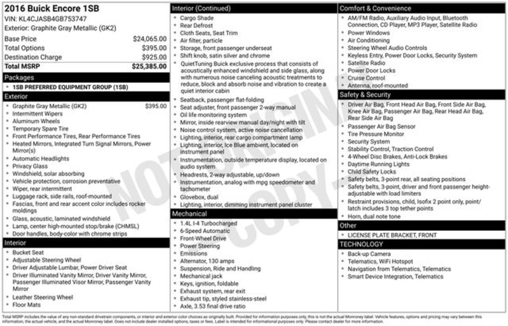 Graphite Gray Metallic 2016 Buick Encore 4D Sport Utility FWD 6-Speed Automatic Electronic with Overdrive ECOTEC 1.4L I4 SMPI DOHC Turbocharged VVT