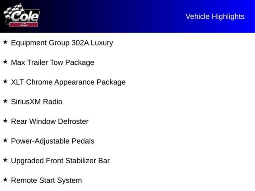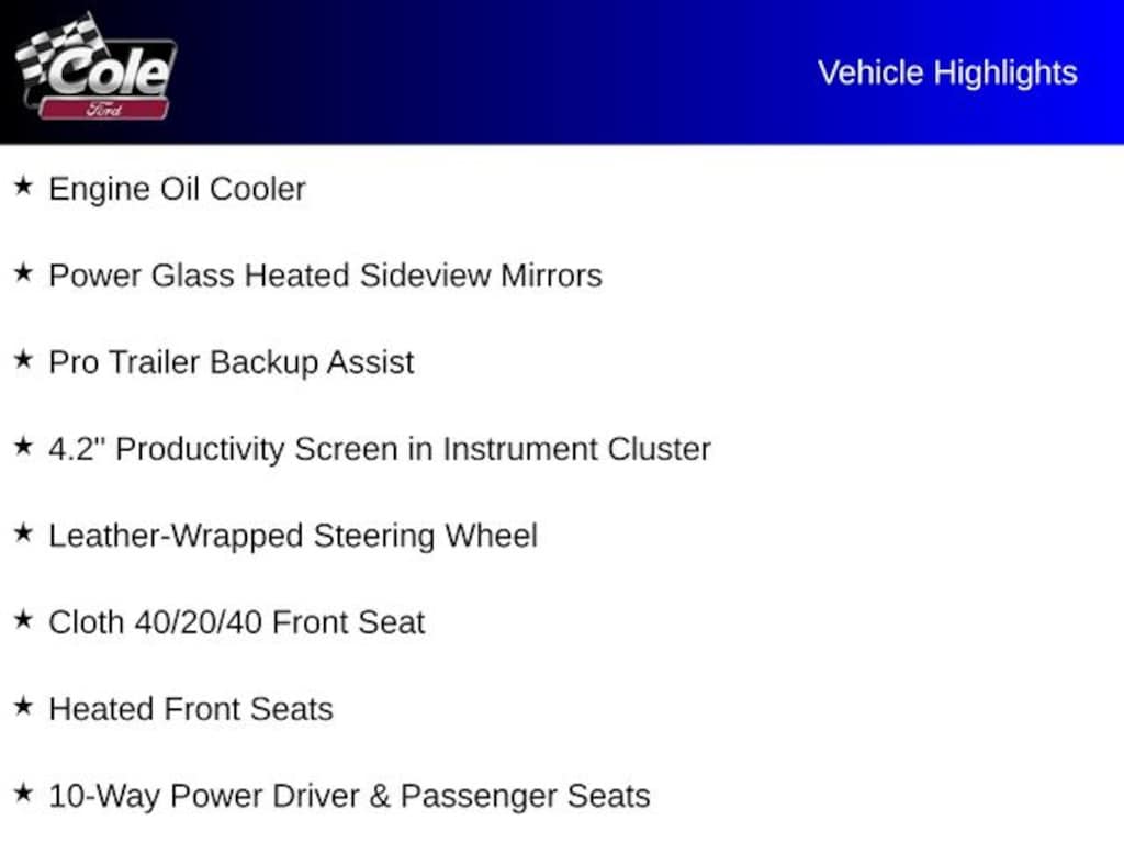4WD, 10-Way Power Driver & Passenger Seats, 4.2" Productivity Screen in Instrument Cluster, Class IV Trailer Hitch Receiver, Cloth 40/20/40 Front Seat, Engine Oil Cooler, Equipment Group 302A Luxury, Extended Range 36 Gallon Fuel Tank, Fixed Backlight w/Privacy Glass, Heated Front Seats, Integrated Trailer Brake Controller, Leather-Wrapped Steering Wheel, Max Trailer Tow Package, Power Glass Heated Sideview Mirrors, Power-Adjustable Pedals, Pro Trailer Backup Assist, Rear Under-Seat Storage, Rear Window Defroster, Remote Start System, SiriusXM Radio, Upgraded Front Stabilizer Bar, XLT Chrome Appearance Package, 110V/400W Outlet, 2-Bar Style Grille w/2 Minor Bars Painted Dark, 4-Wheel Disc Brakes, 6 Speakers, ABS brakes, Accent-Color Step Bars, Air Conditioning, Alloy wheels, AM/FM radio, AppLink/Apple CarPlay and Android Auto, Auto High-beam Headlights, Auto-Dimming Rear-View Mirror, Body-Color Door & Tailgate Handles, Body-Color Front & Rear Bumpers, Box Side Decals, Brake assist, Bumpers: chrome, Compass, Delay-off headlights, Driver door bin, Driver vanity mirror, Dual front impact airbags, Dual front side impact airbags, Electronic Stability Control, Emergency communication system: SYNC 3 911 Assist, Exterior Parking Camera Rear, Front anti-roll bar, Front Center Armrest w/Storage, Front fog lights, Front wheel independent suspension, Fully automatic headlights, Illuminated entry, LED Box Lighting, Low tire pressure warning, Occupant sensing airbag, Outside temperature display, Overhead airbag, Panic alarm, Passenger door bin, Passenger vanity mirror, Power door mirrors, Power steering, Power windows, Power-Sliding Rear Window, Radio data system, Radio: AM/FM Stereo w/6 Speakers, Rear step bumper, Remote keyless entry, Reverse Sensing System, Security system, Single-Tip Chrome Exhaust, Speed control, Speed-sensing steering, Split folding rear seat, Steering wheel mounted audio controls, SYNC 3, Tachometer, Tailgate Step w/Tailgate Lift Assist, Telescoping steering wheel, Tilt steering wheel, Tough Bed Spray-In Bedliner, Traction control, Tray Style Floor Liner, Unique Sport Cloth 40/Console/40 Front-Seats, Variably intermittent wipers, Voice-Activated Touchscreen Navigation, Voltmeter, Wheel Well Liner, Wheels: 17" Silver Painted Aluminum, Wheels: 18" 6-Spoke Machined-Aluminum, Wheels: 20" 6-Spoke Premium Painted Aluminum, XLT Power Equipment Group, XLT Sport Appearance Package, 4WD, 10-Way Power Driver & Passenger Seats, 4.2" Productivity Screen in Instrument Cluster, Class IV Trailer Hitch Receiver, Cloth 40/20/40 Front Seat, Engine Oil Cooler, Equipment Group 302A Luxury, Extended Range 36 Gallon Fuel Tank, Fixed Backlight w/Privacy Glass, Heated Front Seats, Integrated Trailer Brake Controller, Leather-Wrapped Steering Wheel, Max Trailer Tow Package, Power Glass Heated Sideview Mirrors, Power-Adjustable Pedals, Pro Trailer Backup Assist, Rear Under-Seat Storage, Rear Window Defroster, Remote Start System, SiriusXM Radio, Upgraded Front Stabilizer Bar, XLT Chrome Appearance Package.
