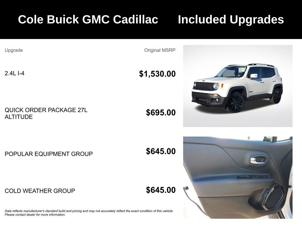 WE DELIVER! BUY ONLINE-TEXT-EMAIL-CHAT-PHONE AND WE WILL DELIVER YOUR NEXT VEHICLE TO YOUR DOOR! FROM OUR SALES FLOOR TO YOUR DOOR! IT'S THAT EASY!Recent Arrival! CARFAX One-Owner. Clean CARFAX.Alpine White 2017 Jeep Renegade Altitude 4D Sport Utility 4WD 9-Speed 948TE Automatic 2.4L I4 MultiAir115V Auxiliary Power Outlet, 16 x 6.5 Aluminum Wheels, 4-Wheel Disc Brakes, 40/20/40 Rear Seat w/Trunk Pass-Thru, 6 Speakers, ABS brakes, Air Conditioning, Air Conditioning ATC w/Dual Zone Control, All-Season Floor Mats, Alloy wheels, Altitude Package, AM/FM radio: SiriusXM, Anti-whiplash front head restraints, Auto-Dimming Rear-View Mirror, Black Day Light Opening Moldings, Brake assist, Cloth Low-Back Bucket Seats, Cold Weather Group, Compass, Delay-off headlights, Deluxe Cloth High-Back Bucket Seats, Driver door bin, Driver vanity mirror, Dual front impact airbags, Dual front side impact airbags, Electronic Stability Control, Exterior Mirrors w/Supplemental Signals, Four wheel independent suspension, Front anti-roll bar, Front Bucket Seats, Front Center Armrest, Front fog lights, Front reading lights, Fully automatic headlights, Gloss Black Badging, Gloss Black Fascia Applique, Gloss Black Instrument Panel Bezels, Goodyear Brand Tires (DISC), Heated door mirrors, Heated Front Seats, Heated Steering Wheel, Illuminated entry, Knee airbag, Leather steering wheel, Low tire pressure warning, Normal Duty Suspension, Occupant sensing airbag, Outside temperature display, Overhead airbag, Overhead console, Panic alarm, ParkView Rear Back-Up Camera, Passenger door bin, Passenger vanity mirror, Passive Entry Remote Start Package, Passive Entry/Keyless Go, Popular Equipment Group, Power 4-Way Driver Lumbar Adjust, Power 8-Way Driver Manual 4-Way Passenger Seats, Power door mirrors, Power steering, Power windows, PTC Auxiliary Interior Heater, Quick Order Package 27L Altitude, Radio data system, Radio: Uconnect 3 w/5 Display, Rain Sensitive Windshield Wipers, Rear anti-roll bar, Rear window defroster, Rear window wiper, Remote keyless entry, Roof rack: rails only, Speed control, Split folding rear seat, Spoiler, Steering wheel mounted audio controls, Tachometer, Telescoping steering wheel, Tilt steering wheel, Traction control, Trip computer, Variably intermittent wipers, Vinyl Door Trim Panel, Voltmeter, Wheels: 18 x 8.0 Gloss Black, Windshield Wiper De-Icer.